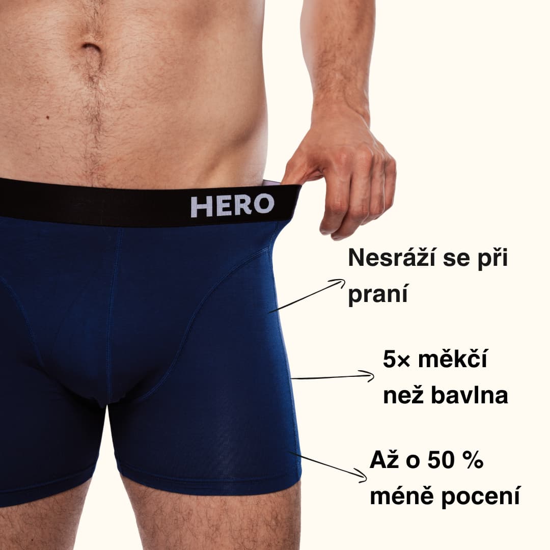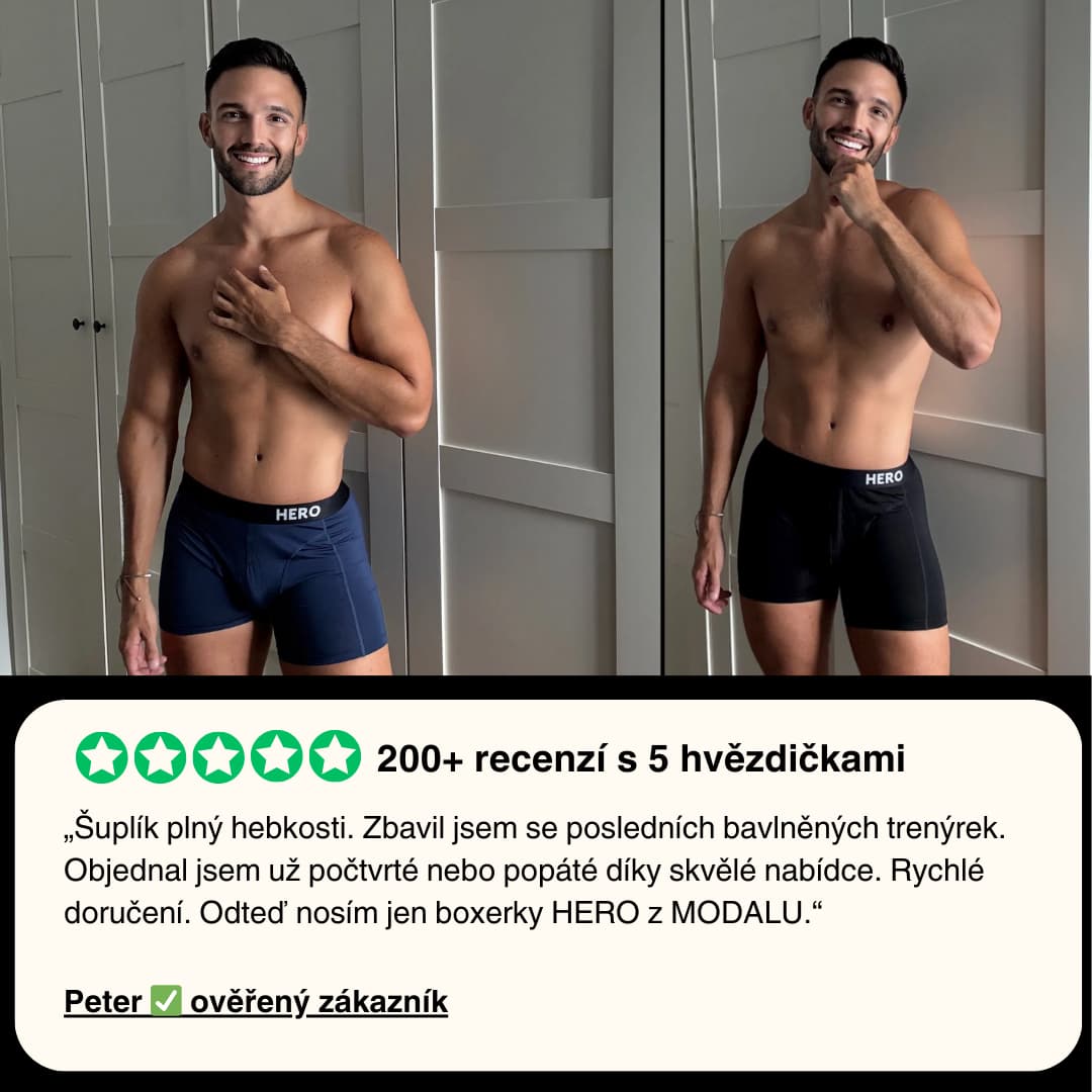 “Boxerky HERO jsou fakt super. Vypadají skvěle, jsou příjemné na dotek a dobře sedí... vše co o nich píšou na webových stránkách je pravda. Materiál je pružný a chladivý, je v nich dostatek prostoru a zároveň podrží, a doma jsem se setkal s příjemnou reakcí.”
